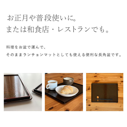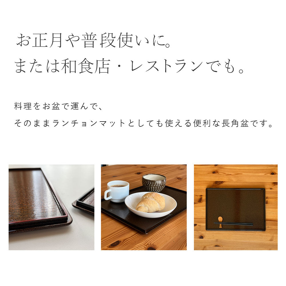 本格和食店でも採用されております、紀州塗りの長角両面膳です。配膳だけでなく、そのままランチョンマットとしてもお使いいただけますので、そのまま持っていってお片付けも楽々でき、大変ご好評の商品です。